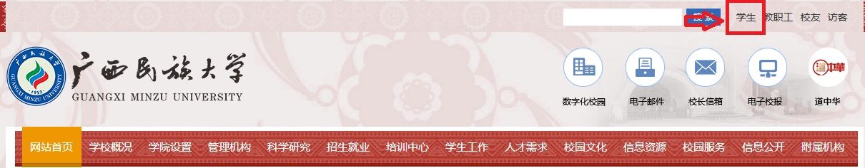 1、进入到民大官网首页(www.gxmzu.edu.cn),右上角“学生”选项。或者