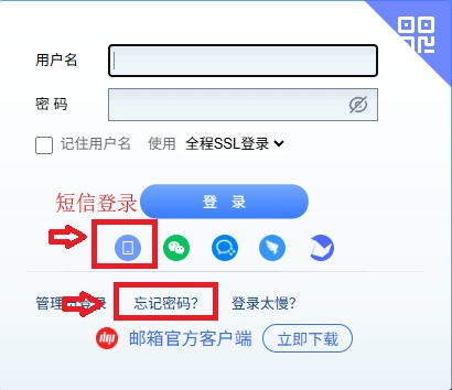 3、进入电子邮件后,可以先使用手机短信登录,如果不行,则选择下方的“忘记密码”选项。