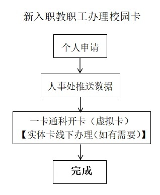 新进教职工先到人事处报到,在人事系统录入人员基本信息(入职部门、姓名、工号、身份证号、手机号等基本信息),人事处推送数据,网络与信息化管理中心线上开通校园卡虚拟卡(扫二维码使用,详见校园卡虚拟卡使用说明)。