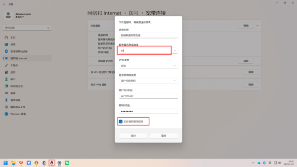 ◦ 勾选「记住此密码」选项:后续电脑启动或需重新连接时,系统会自动调用保存的密码完成拨号,无需重复输入;