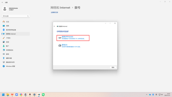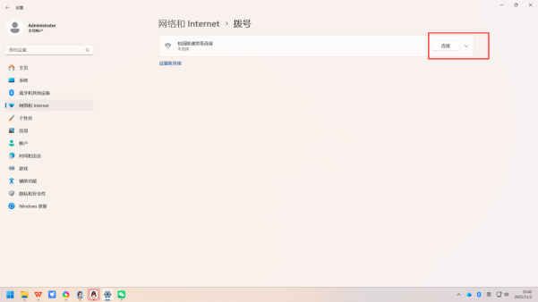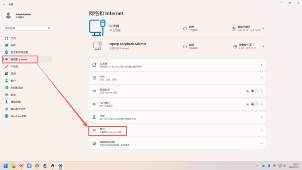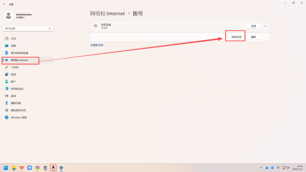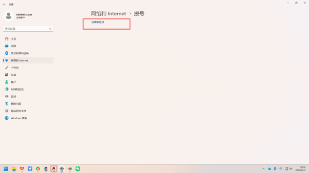 2. 定位网络设置:在设置窗口左侧的菜单栏中,点击「网络和 Internet」选项;切换到右侧界面后,找到并点击「拨号」选项,进入拨号专属设置页面(示意图如下)。