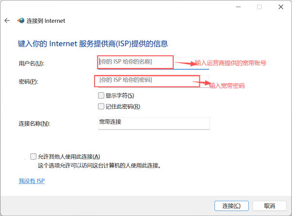 ◦ 连接名称:自定义该拨号连接的名称(如 “家庭电信宽带”“校园联通拨号” 等,便于后续快速识别)。