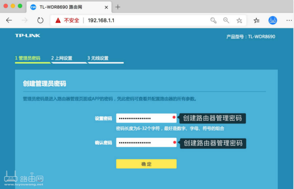 • 在 “创建路由器管理密码” 板块,设置符合要求的密码(密码长度需为 6-32 个字符),并再次输入密码完成确认,最后点击 “确定” 按钮完成管理员密码创建。