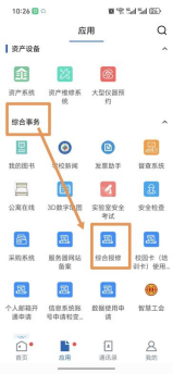 在 APP 首页,找到 “综合事务” 功能模块(通常位于 “应用” 栏目或首页中部),点击进入后,在模块内选择 “综合报修” 入口(图示:“综合事务” 模块包含 “发票助手”“公寓在线”“安全检查”“3D 数字地图” 等功能)。