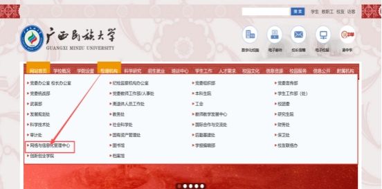 2. 在官网首页导航栏中,找到 “管理机构” 栏目,点击展开后,选择 “网络与信息化管理中心”