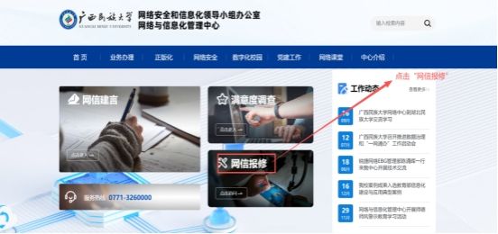 进入 “网络与信息化管理中心” 主页后,在页面显著位置(如左侧功能栏、中部业务办理区)找到 “网信报修点击访问” 按钮,点击进入报修系统。