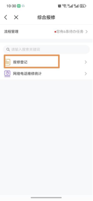 1. 进入 “综合报修” 页面后,点击 “报修登记”(页面顶部可查看 “待办任务”“报修统计” 等);