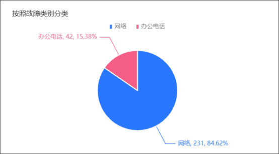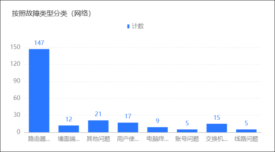 2.网络故障分类:网络故障报修中,各类原因占比情况如下:路由器问题147项(占比最高)、用户操作问题17项、交换机故障15项、线路问题5项、墙面端口问题12项、账号问题5项、其他问题21项、用户使用问题17项。