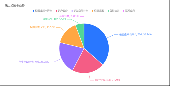 线上业务以个人高频业务为主,本月累计服务1921人次,覆盖5类核心业务,业务分布呈现明显的集中性特征,具体如下:校园虚拟卡开卡700人次, 销户业务408人次,学生自助补卡405人次,权限设置299人次,自助挂失107人次,延期业务2人次。