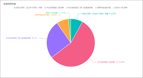1.累计处理系统及终端问题62例,其中校园卡系统(含业务子系统)故障5例,学生宿舍智能门锁故障35例,学生宿舍园区门禁人脸通道故障16例,消费终端设备问题5例,自助补卡机故障1例。