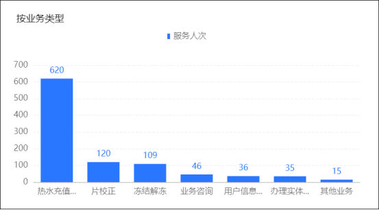 2.按业务类型:热水充值问题处理620人次,片校正120人次,冻结解冻109人次,业务咨询46人次,用户信息变更36人次,办理实体卡(含办卡、补换卡)35人次,其他业务15人次。